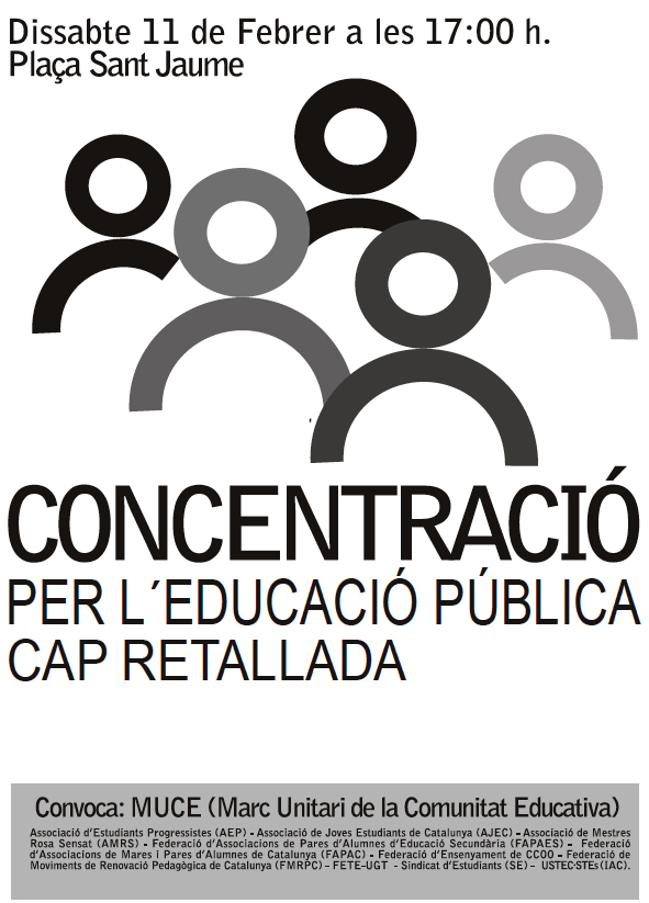 La Comunitat educativa de Catalunya fa una crida a les famílies, estudiants, professionals de l’educació, i a tota la ciutadania a mobilitzar-se participant en la concentració del proper dissabte dia 11 de febrer a les 17 h per denunciar els efectes que estan tenint les retallades sobre el model educatiu públic, afectant les polítiques educatives, socials i laborals, vulnerant drets que posen en perill la igualtat d’oportunitats, la cohesió social i, per tant, el futur dels nostres infants i joves. No a l’aprovació del pressupost d’Ensenyament de la Generalitat per al 2012, el qual és inferior al del 2007, tot i comptar amb 150.000 alumnes més. Reclamem per l’educació prioritat en la despesa pública perquè és una de les claus per construir el futur.