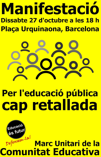 El MUCE (Marc Unitari de la Comunitat Educativa) fa una crida a la participació en la manifestació que convoca dissabte, 27 d’octubre, a Barcelona per protestar contra les retallades que ja estem patint en l’educació i les que es puguin produir coincidint amb l’aprovació dels propers pressupostos de la Generalitat de Catalunya.