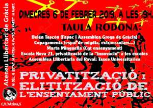 - Dimecres 6 de Febrer, a les 19h: Ateneu Llibertari (C/Alzina 5)TAULA RODONA, PRIVATITZACIÓ I ELITITZACIÓ A L’ENSENYAMENT PÚBLIC. Participen: