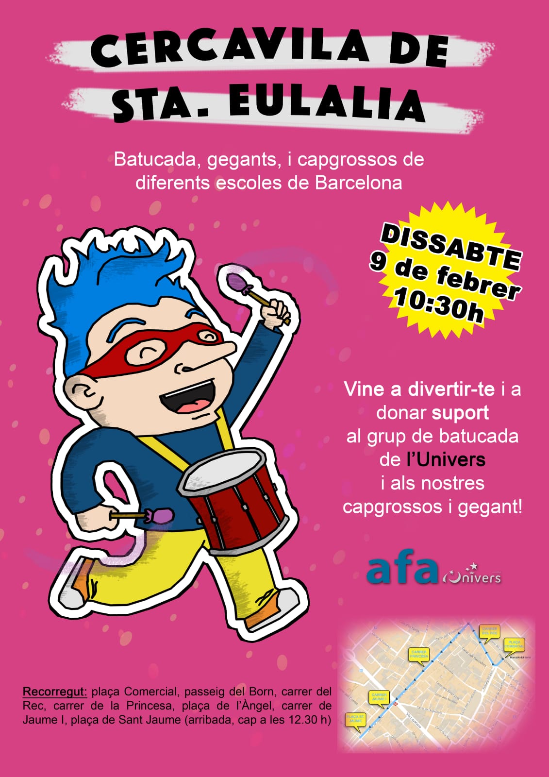 El dissabte 22 de febrer sortirem amb disfressa de Jardinets de Gràcia, fins a la plaça de la Vila, a les 17.30. Som els “FREESTYLERS de l’Univers” i desfilare amb el grup de batucada de l’escola “Batecs de L’Univers”. Pots afegir-te al grup de whatsapp.