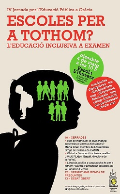 Hola! Aquest DISSABTE 4 DE MAIG A LES 10H A L’ESCOLA L’UNIVERS (Bailèn 229, entrada pel passatge) l’Assemblea Groga de Gràcia (AGG) organitza la IV Jornada per l’Educació Pública a Gràcia enguany amb el títol Escoles per a tothom? L’educació inclusiva a examen. Un tema que ens afecta a totes perquè determina el model d’escolaContinua llegint “Escoles per a tothom? L’educació inclusiva a examen”