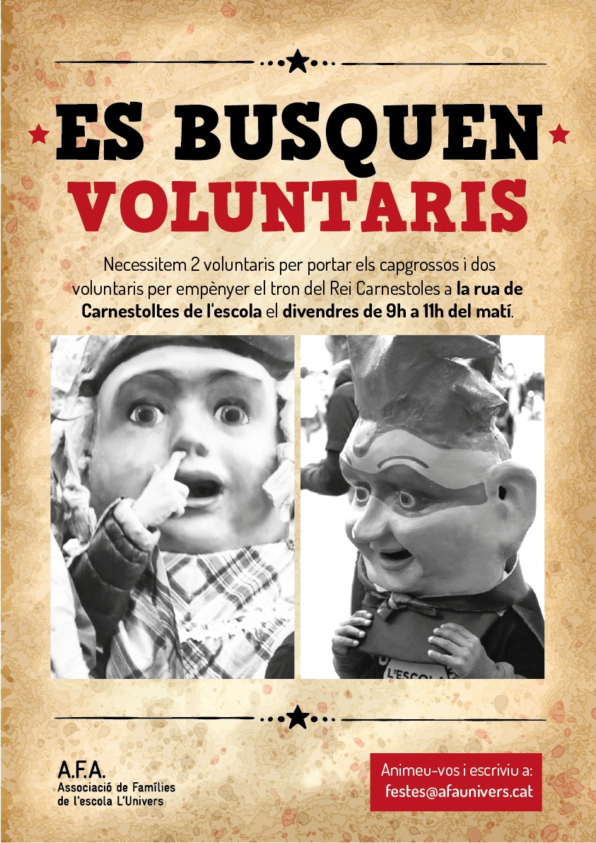 Veniu a participar a la Rua de Santa Eulàlia. El 10 de febrer Baixarem per la Rambla fins a la plaça Sant Jaume. Necessitem voluntaris que vulguin portar els gegants i capgrossos de l’Univers. Ens trobarem a les 10:30h a la Plaça dels Àngels.